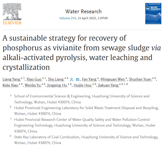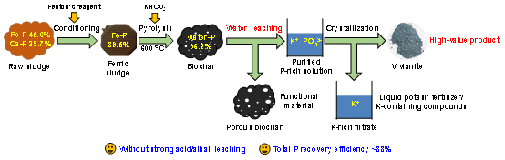 磷是一种不可替代又不可再生的重要资源。据预测,世界磷矿资源将在50至100年内耗尽。同时,被人类开采利用的磷资源大部分随污水进入污水处理厂,污水中90%以上的磷最终富集在处理的副产物污泥中。因此,从市政污泥中回收磷对缓解磷资源短缺和促进污泥资源化利用具有现实意义,近年来成为研究热点。然而,污泥中磷的存在形式复杂,难以直接回收,如何从污泥中高效回收磷成为了难题。热解技术因能实现污泥的高效减量化、无害化和资源化受到了广泛关注。同时,污泥热解得到的生物炭富集了原料中绝大部分磷,使其具有磷回收的潜质。但污泥热解炭中磷的可生物利用性相对较低,且存在潜在环境风险(重金属、多环芳烃等污染物),限制了其直接土地应用;酸/碱提取法存在磷回收效率低和共浸出的重金属去除流程复杂的问题。据报道,K和Na等碱金属元素在热处理条件下对磷元素有很强的亲和力,可以形成水溶性碱金属磷酸盐。因此,本研究提出了一种通过碱活化热解-水浸-结晶法从污泥中回收磷的可持续策略。在碱活化热解过程中,污泥中的难溶性金属磷酸盐(FePO4、AlPO4、Ca3(PO4)2)可以转化为生物炭中的水溶性碱金属磷酸盐,因此通过水浸法即可从生物炭中高效提取磷,所得富磷液经除杂后可制备高附加值产品蓝铁矿,实现污泥中磷的环保、便捷、高效回收,该路线流程如图1所示。