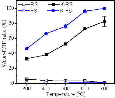 图4 原泥和Fenton调理污泥样品(RS、FS)及加入50 wt%的KHCO3活化剂后的污泥样品(K-RS、K-FS)在不同温度(300-700 oC)下热解所得生物炭的水溶性磷占总磷含量的比例