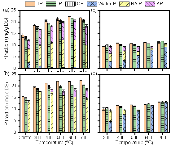 图3 不同污泥样品和不同污泥样品热解所得生物炭中的P形态分布:(a)原泥和(b)Fenton调理污泥以及(c)加入50 wt%的KHCO3活化剂的原泥和(d)加入50 wt%的KHCO3活化剂的Fenton调理污泥在不同温度(300-700 oC)下热解所得生物炭。对照组为热解前的污泥样品.