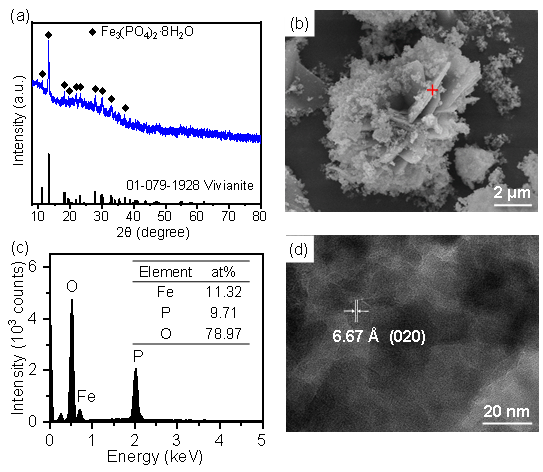图5 (a)回收磷产品的XRD图谱、(b)SEM图像、(c)SEM-EDS结果和(d)HRTEM图像