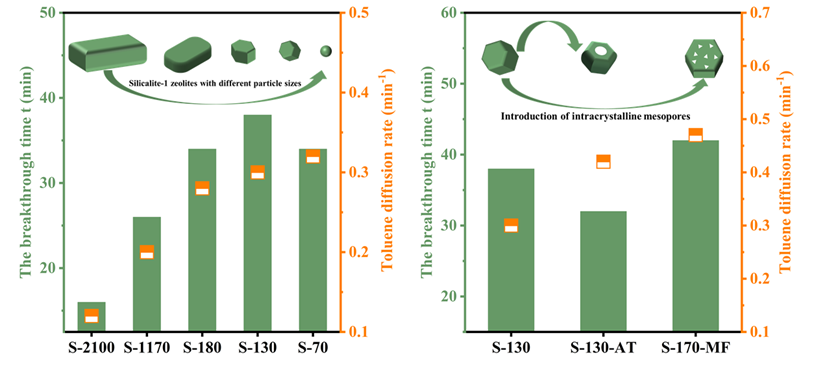 图.不同粒径silicalite-1沸石的甲苯吸附穿透时间和扩散速率(左)和不同晶内介孔纳米silicalite-1沸石的甲苯吸附穿透时间和扩散速率(右)(Microporous and Mesoporous Materials, 2023, 356,112596)