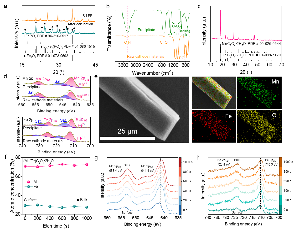 图 2. a)煅烧前和煅烧后S-LFP的XRD谱图,b)原始废旧正极材料和沉淀物的FTIR谱图,e)沉淀物的SEM图像(比例尺为100 μm)和EDS能谱图,f-h)沉淀物的蚀刻XPS表征:f)原子浓度,g,h)Mn 2p和Fe 2p XPS能谱图