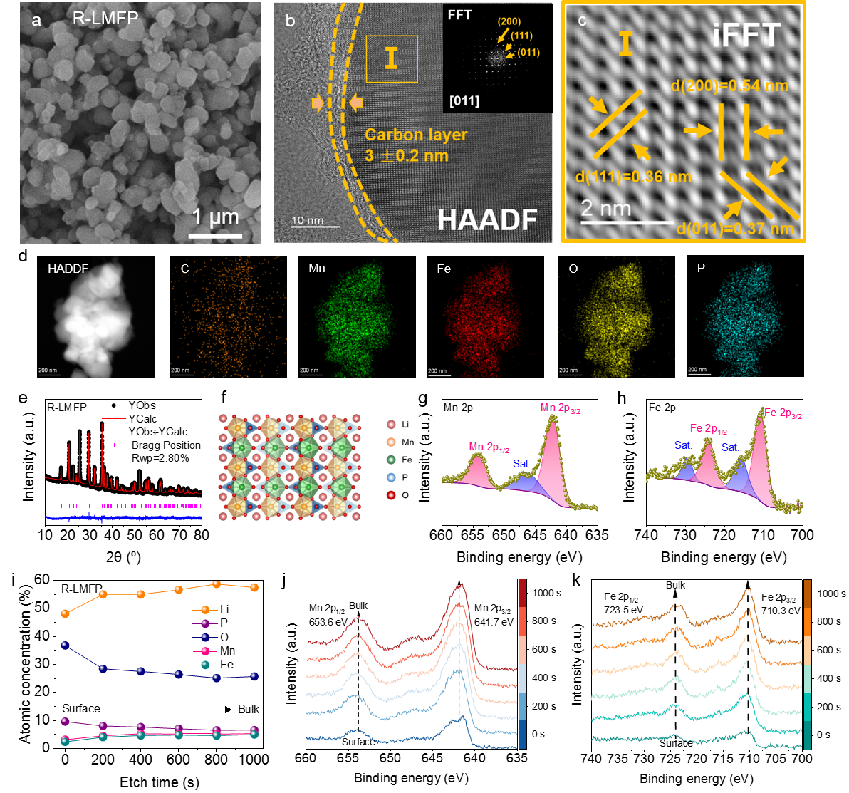 图 3. R-LMFP的微观结构特征:a)扫描电镜图像(比例尺为1 μm),b)HADDF-STEM图像(插图为FFT图像)(比例尺为10 nm),c)iFFT图(比例尺为2 nm),e)XRD谱图和Rietveld精修结果,f)R-LMFP材料晶体结构示意图,g,h)Mn 2p和Fe 2p的XPS能谱图