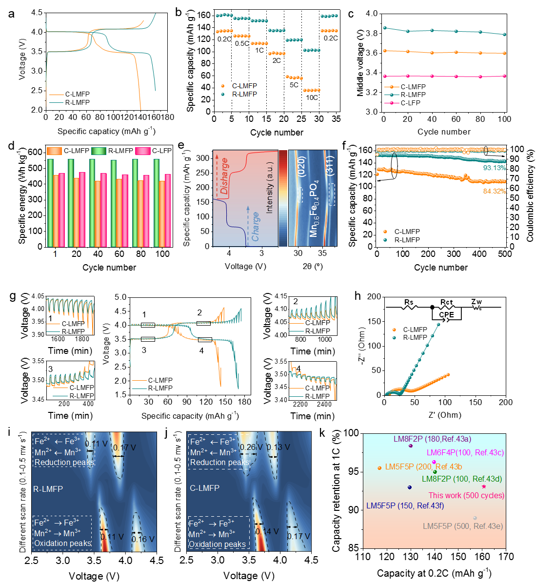 图 4. R-LMFP和C-LMFP的电化学性能比较:a)在0.2C下的充放电曲线,b)倍率性能,c,d)在1C下100次充放循环过程中R-LMFP、C-LMF和C-LFP的放电中值电压和能量密度,e)R-LMFP的充放电曲线和原位XRD等高图,f)1C下500次充放循环性能曲线,g)0.2C下GITT曲线,h)在4.0 V的EIS曲线图,i,j)不同扫描速率下的CV曲线等高图,k)本研究中的R-LMFP与具有代表性的文献中LMFP材料的电化学性能比较