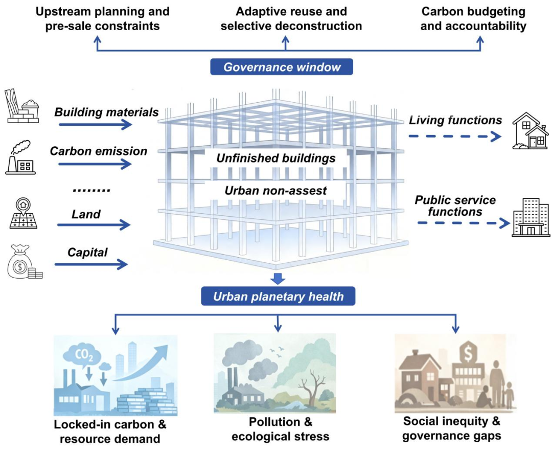 在快速城市化进程中,烂尾建筑并不只是长期停工与闲置的楼体,更是被忽视的资源、环境与社会负担。3月19日,beats365段华波副教授与澳大利亚国立大学白雪梅教授合作,在Cell Press细胞出版社可持续发展期刊One Earth上发表题为“China’s unfinished buildings have created stranded assets with substantial resource and socioeconomic costs”研究论文。基于全国140多个城市的1400余个烂尾项目,研究首次系统量化了其造成的资源浪费、环境影响与经济损失,提出“城市负资产”概念揭示其占用土地、消耗资本却未能提供城市功能的本质。通过构建物质流分析、生命周期评价与经济核算的耦合评估框架,研究发现烂尾建筑明显集中于新城新区与城市边缘扩张区域,并与公共服务薄弱、社会脆弱性较高区域高度相关,为城市更新与综合治理提供了科学依据。