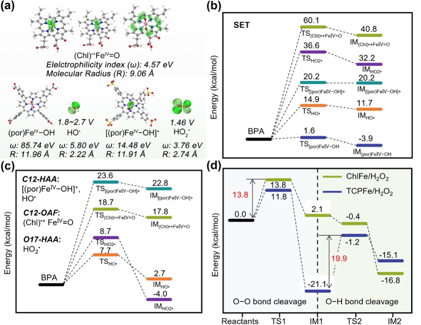 图4. 不同活性物种的反应活性及相关反应能量曲线。(a) ChlFe/H2O2体系中(Chl)•+FeⅣ=O、TCPFe/H2O2体系中(por)FeⅣ−OH和HO•、TSPFe/H₂O₂体系中[(por)FeⅣ−OH]⁺和HO2•的SOMO和反应活性特征。(b) SET途径、(c) C12位点HAA途径、O17位点HAA途径和C12位点OAF途径的活性物种氧化BPA初始基元反应的示意性自由能图。(d)铁卟啉活化H2O2过程中的能垒。