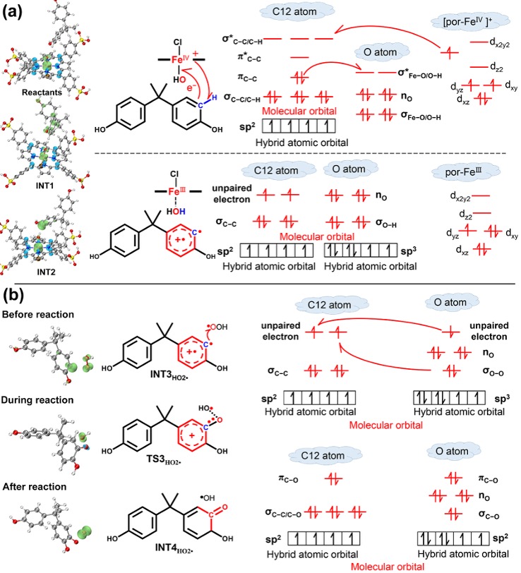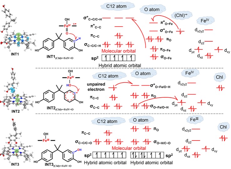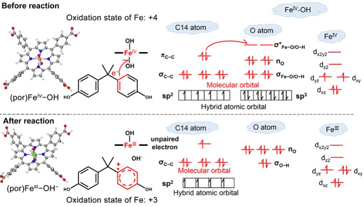 图6. (por)FeⅣ−OH在C14处降解BPA的自旋密度分布和SET反应机理。BPA的π共轭体系向σ*Fe−O轨道提供电子,从而断裂Fe–O键,生成TCPFe和瞬态BPA自由基阳离子(BPA•⁺)。
