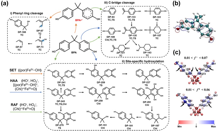 图3. BPA的降解途径和反应位点预测。(a) BPA在铁卟啉/H2O2体系中的降解途径。(b) BPA的最高占据分子轨道。(c) BPA的简缩福井指数。