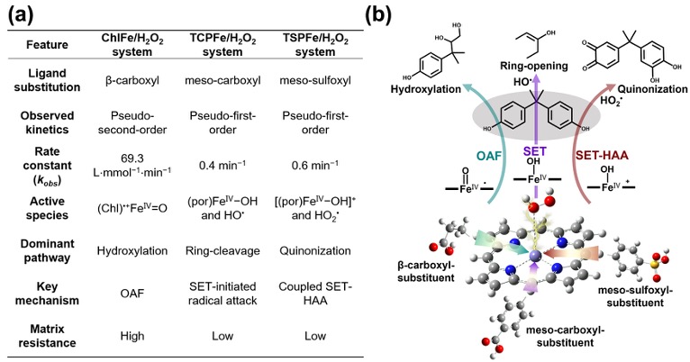 高价铁-氧物种的活性受其配位球电子效应的显著影响。本研究制备了三种结构精确的铁卟啉,通过调整外围取代基的位置和性质,系统探究了其对H2O2活化机制的影响。结果显示,β-位羧基取代的ChlFe体系产生的非质子化(Chl)•+FeⅣ=O物种可实现BPA高效降解,反应过程符合准二级动力学,表现出卓越的抗背景基质干扰能力;而meso-位取代的TCPFe和TSPFe则诱导生成质子化的FeⅣ−OH物种及相应的∙OH或HO2∙自由基,对BPA的降解遵循准一级动力学。通过产物解析与DFT计算,本研究成功建立了“配位结构-活性物种-降解路径”之间的直接关联。
