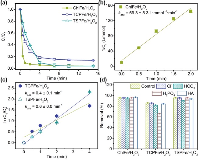 图1. BPA在铁卟啉/H2O2体系中的降解行为。(a) 铁卟啉/H2O2体系中BPA的降解曲线。(b) ChlFe/H2O2体系中的准二级动力学。(c) TCPFe/H2O2和TSPFe/H2O2体系中的一级动力学。(d)不同基质对铁卟啉/H2O2体系中BPA降解的影响。初始实验条件:ChlFe/H2O2体系中,ChlFe = 0.12 mM,H2O2 = 5 mM,BPA = 0.1 mM,pH = 9;TCPFe/H2O2体系中,TCPFe = 0.02 mM,H2O2 = 4 mM,BPA = 0.3 mM,pH = 7.5。TSPFe/H2O2体系中,TSPFe = 0.02 mM,H2O2 = 4 mM,BPA = 0.3 mM,pH = 4。Cl−= 5 mM,HCO3− = 5 mM,H2PO4−= 5 mM,HA = 20 mg/L。