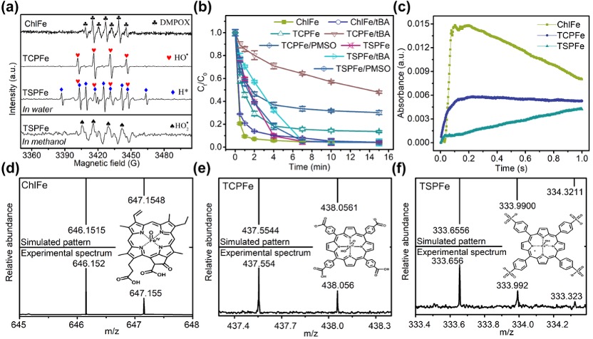 图2. 铁卟啉/H2O2体系中活性物种的鉴定。(a) 铁卟啉/H2O2体系在水溶液或甲醇溶液中的DMPO捕获EPR谱图。(b)添加不同淬灭剂后,铁卟啉/H2O2体系中BPA的降解曲线。(c) 反应过程中铁卟啉和H2O2混合物在590 nm处的吸光度随时间的变化。(d) ChlFe、(e) TCPFe和(f) TSPFe与H2O2混合物的ESI-FTMS谱图。初始实验条件:ChlFe = 0.12 mM,H2O2 = 5 mM,BPA = 0.1 mM,pH = 9(ChlFe/H₂O₂体系)。TCPFe = 0.02 mM,BPA = 0.3 mM,H2O2 = 4 mM,pH = 7.5(TCPFe/ H2O2 体系);TSPFe = 0.02 mM,H2O2 = 4 mM,BPA = 0.3 mM,pH = 4(TSPFe/H2O2 体系);PMSO = 200 μM,tBA = 1.3 M。