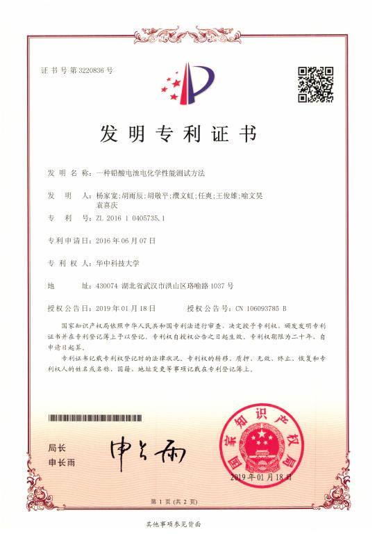杨家宽教授团队授权国家发明专利1项《一种铅酸电池电化学性能测试方法》