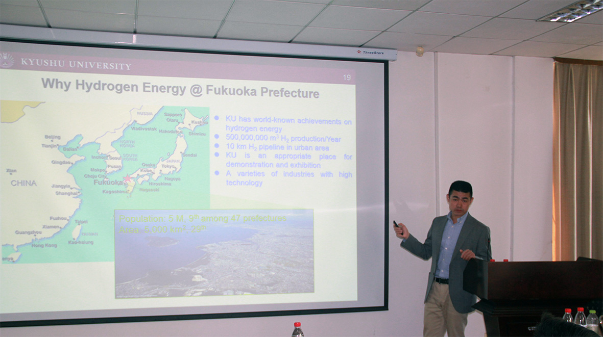 Jensen教授曾于2016年获得氢能奖,他报告题目为“Hydrides for Multi-Funcational Energy Storage Applications”。报告中,他首先介绍了氢能的发展并就氢能利用的安全性作了介绍,随后用简单生动的语言向大家讲述了他科研小组在储氢材料领域最新的研究成果,主要包括新型金属硼氢化合物的合成设计、储氢和离子导电性,并通过形成共晶熔融体系调控材料性能,通过原位粉末X射线衍射研究了氢释放和吸收的机理。Jensen教授总结说,氢化物作为多功能性材料具有广泛科学意义和巨大应用潜力。九州大学氢能源国际研究中心李海文教授的报告题目为“Perspectives and Challenges of Metal Boranes for Energy Applications”,李教授着重就氢能源制造、储存、在日常生活中的应用及九州大学氢能源研究现状和发展方向等作了讲解。报告中,他同时就课题组最新的研究进展进行了简要介绍。最后,李教授还邀请大家去九州大学乘坐Mirai氢燃料电池汽车,并实地体验氢能源在日本日常生活中的应用。