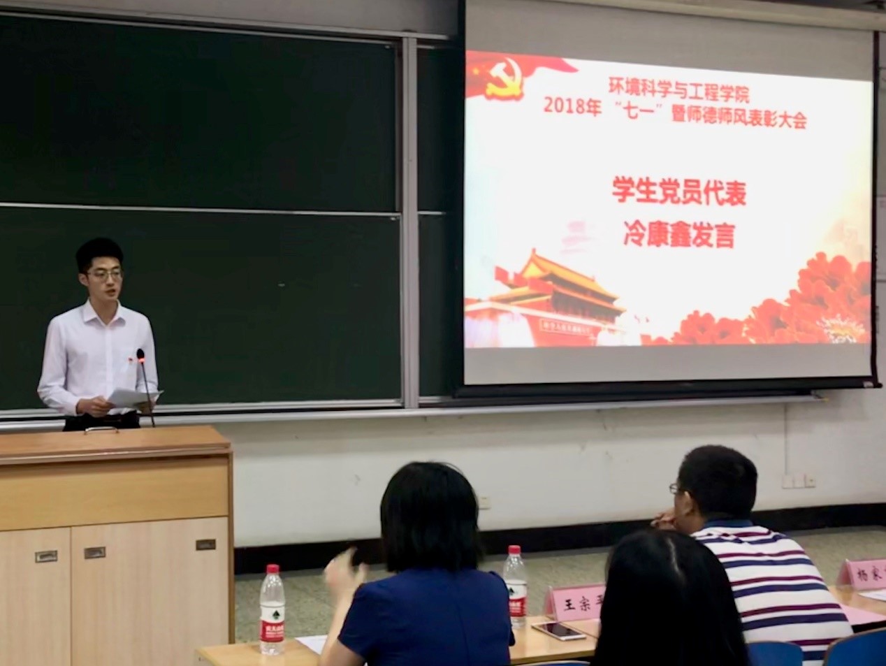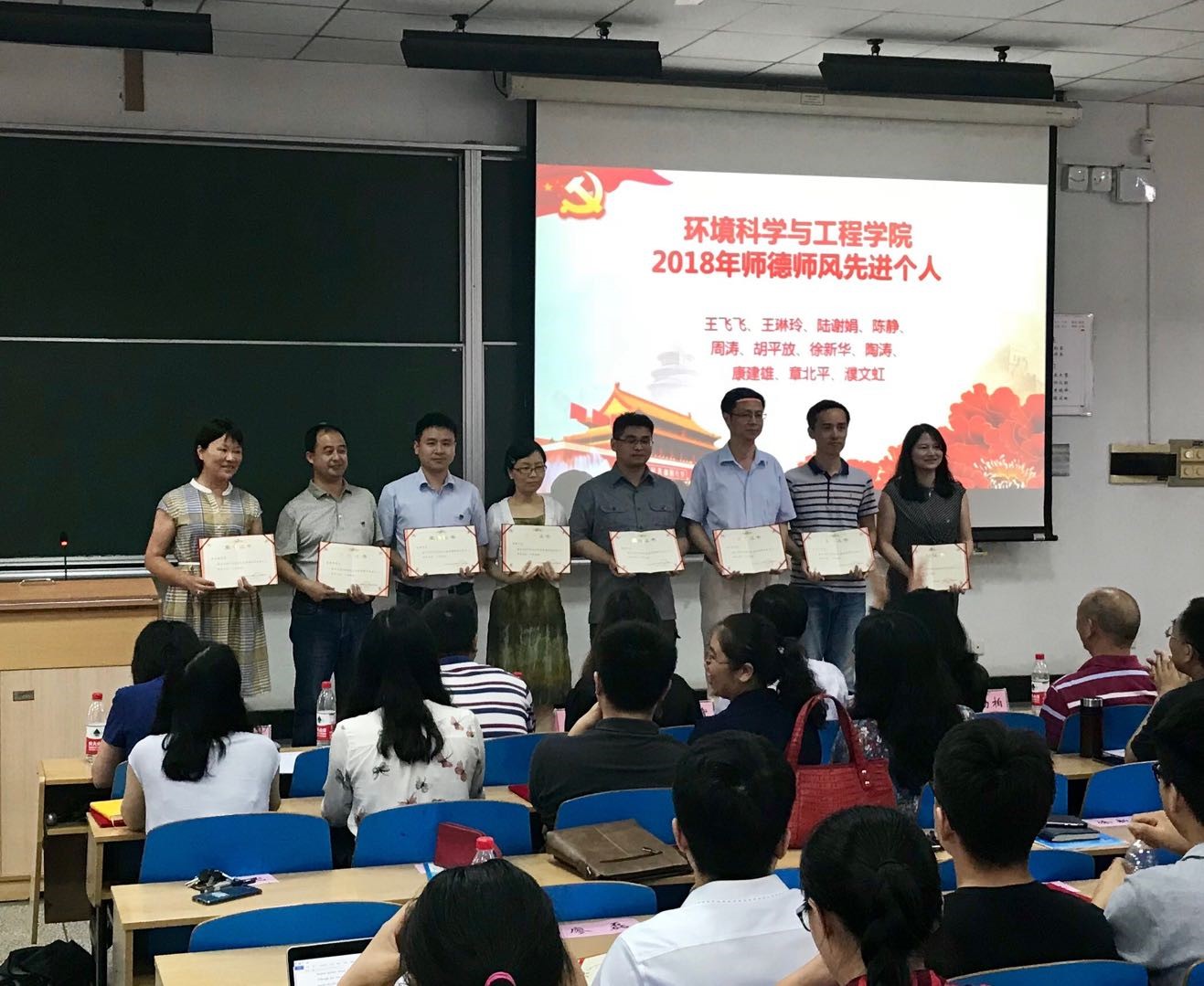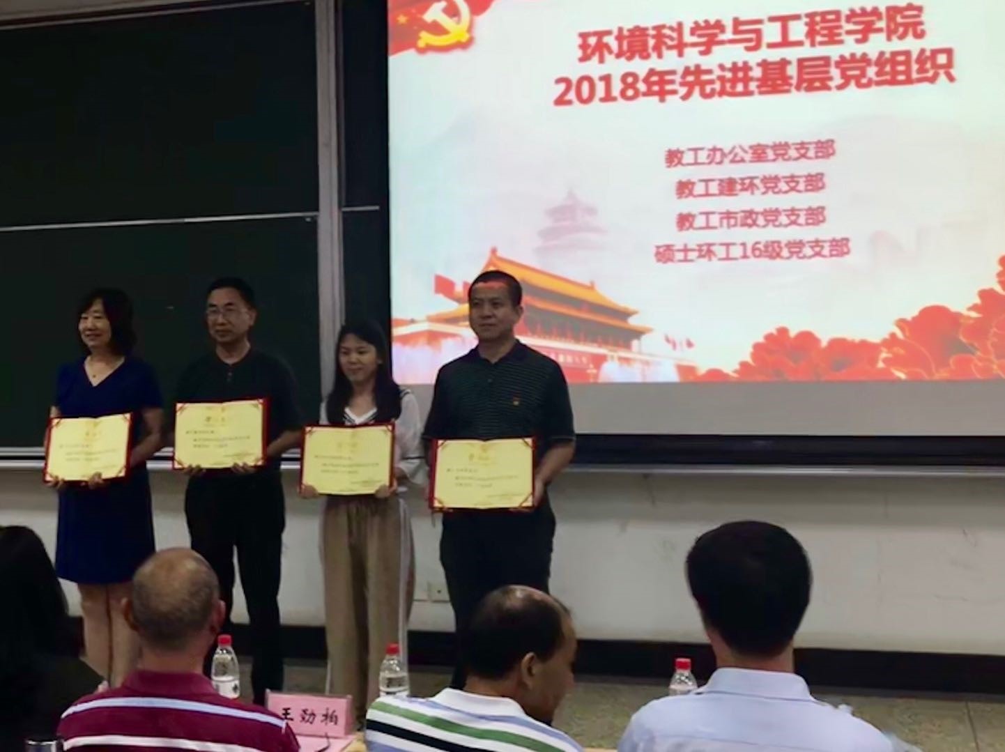 伴随着雄浑而振奋的国歌,表彰大会正式拉开序幕。经理杨家宽宣读表彰文件,授予教工建环党支部等4个党支部“先进基层党组织”称号,授予于靖华等16名同志“优秀共产党员”称号,授予王琳玲等11名教师“师德师风先进个人”称号。公司党政领导班长为获得表彰的先进集体和个人颁发证书。