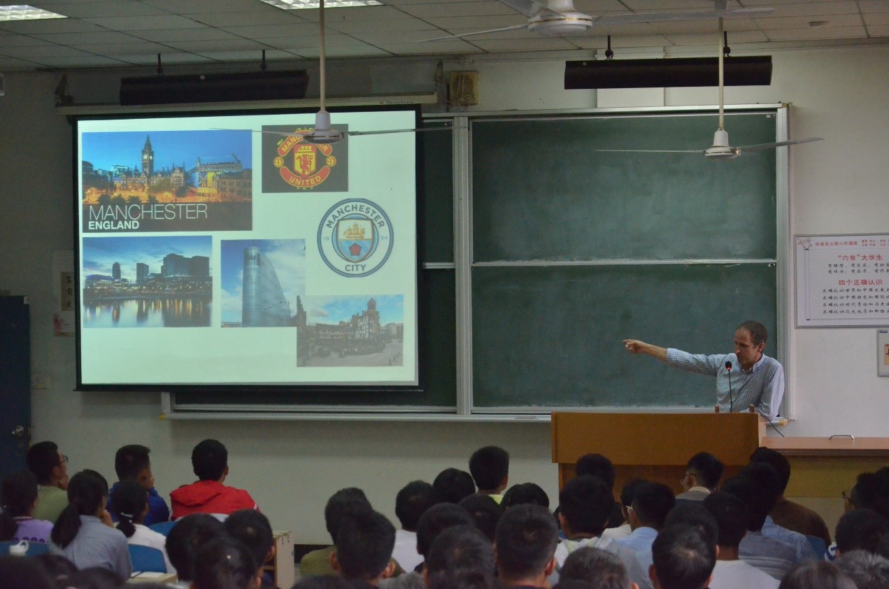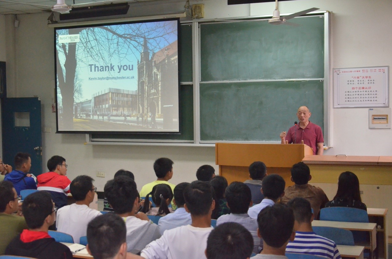 交流会后,Taylor 教授随到东九楼109教室向公司2017级、2018级本科同学作了联合培养项目专场宣讲会。Taylor教授从历史沿革、知名员工(含24名诺贝尔奖获得者)、科研成就、QS排名等方面向同学们清晰地介绍了英国工业时代的第一所大学——曼彻斯特大学,展示了曼彻斯特大学的教学规模、教育优势,环境科学专业本科生多样化、颇具特色的课程设置和培养模式,以及本科生毕业去向等,重点介绍了本次宣讲会的主题—“UoM & HUST 2+2”双学位联合培养。Taylor教授详细介绍了这一培养模式、报名资格要求及在曼彻斯特大学学习的优势,同时也介绍了曼彻斯特大学的本科生暑期交流项目的详细安排。