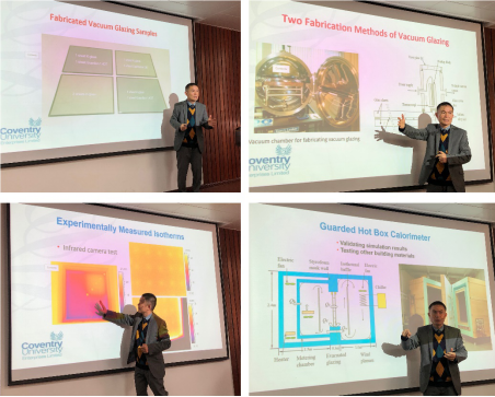 方博士结合中英文,由浅入深,为大家讲解了考文垂大学团队在真空玻璃窗户及其衍变产品的性能分析与制造方面的研究成果。首先,方博士从多层真空玻璃窗对建筑全年热负荷降低的作用讲起,解释其对于节省建筑能耗的巨大潜力,阐述系统的重要性。然后,对夹层玻璃窗在不同太阳入射角与透射率之间的关系、不同玻璃夹层厚度与U值系数之间的关系作出详细讲解。
