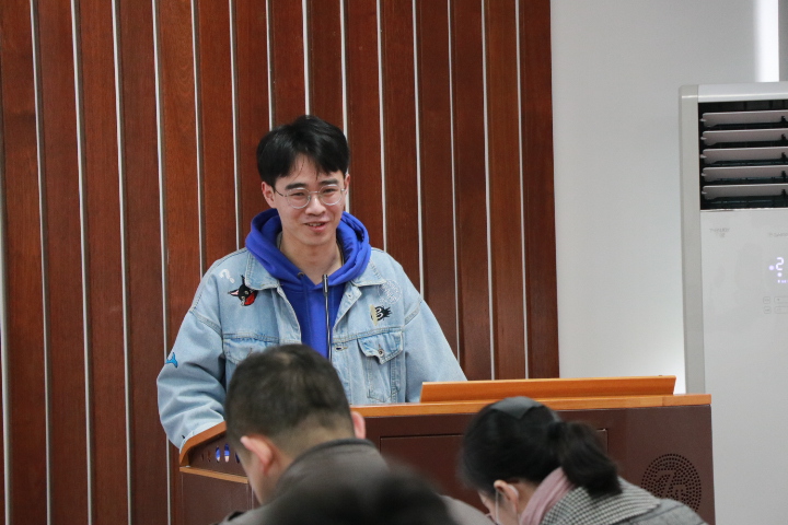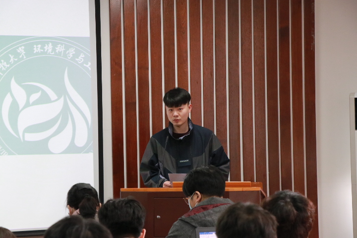 第五组由姜惕明同学进行答辩,题目是“利用太阳能表面光热蒸发处理垃圾渗滤液膜浓缩液的装置设计”。他分析了垃圾渗滤液膜浓缩液对环境的危害,介绍了传统处理的弊端,展示了利用太阳能设计的光蒸发装置,装置可以有效减少环境污染,提高废液处理效率,有利于解决目前的一些环境污染问题。