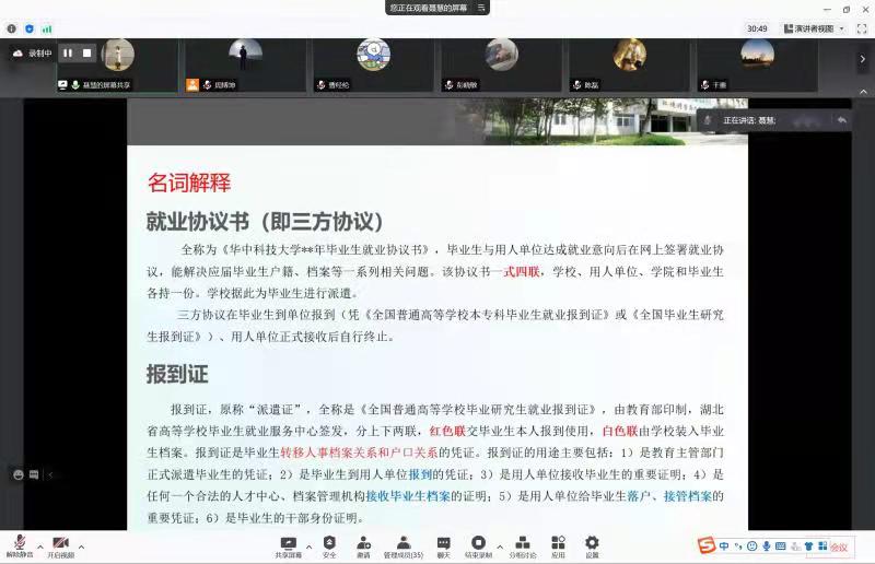 会议开始,聂慧首先分析了公司各专业重点就业方向与就业单位,帮助毕业生们进一步了解了就业形式;她详细讲解了三方协议的签订流程以及档案、报到证等派遣工作要求,重点强调了关于违约的后果与相关流程,提醒同学们签约时一定要慎重,非必要情况尽量不要违约。