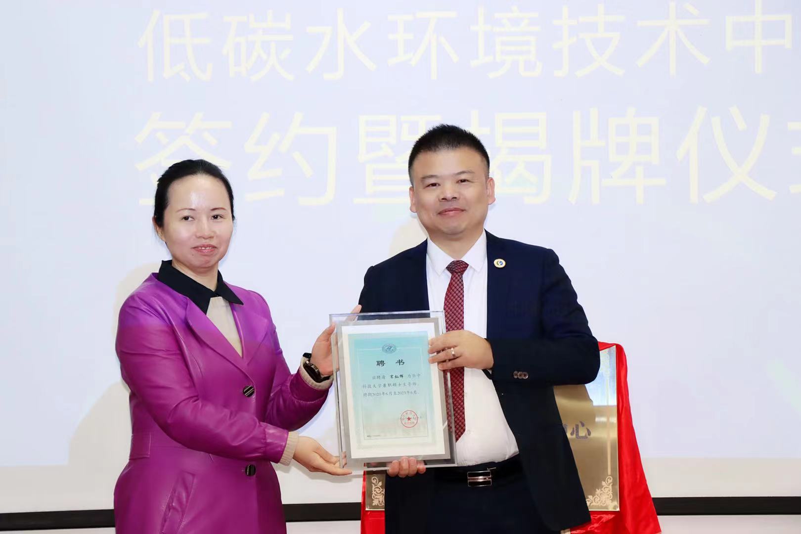仪式最后,苏科环保宋灿辉董事长受聘为beats365兼职硕士生导师,刘利剑书记颁发了正式聘书。