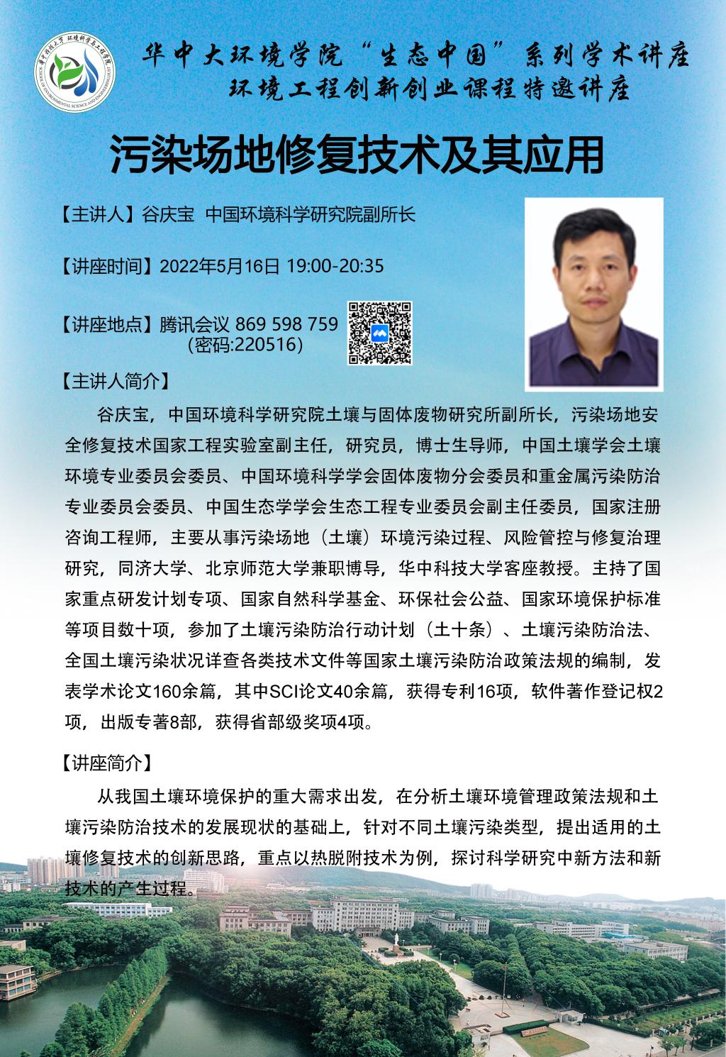 2022年5月16日晚上,应公司王琳玲老师和侯慧杰老师的邀请,中国环境科学研究院土壤与固体废物研究所副所长谷庆宝研究员在东十二楼111室为公司师生做了《污染场地修复技术及其应用》学术讲座。本次环境工程创新创业课程特邀讲座由王琳玲老师主持,​beats365师生和行业专家学者在线上线下一同参加了本次交流活动。
