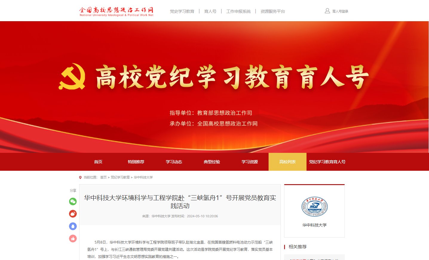 5月10日,全国高校思想政治工作网报道公司赴“三峡氢舟1”号开展党员教育实践活动。