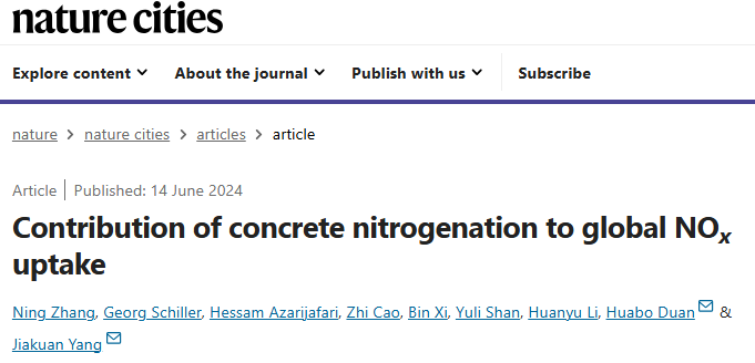 《自然》子刊Nature Cities在线发表了题为“全球尺度混凝土固氮对NOx吸收的贡献”(Contribution of concrete nitrogenation to global NOxuptake)的最新研究成果。beats365为论文通讯作者单位,第一作者为德国德累斯顿工业大学/莱布尼兹生态城市与区域发展研究所博士生张宁,beats365段华波副教授和杨家宽教授为共同通讯作者。