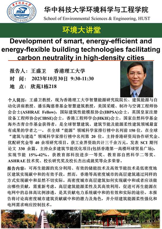 2023年10月30日上午欣苑1栋409会议室,香港理工大学王盛卫教授为beats365师生作《以智慧、能源高效和能源柔性的建筑技术促进高密度城市碳中和的研究》(Development of smart, energy-efficient and energy-flexible building technologies facilitating carbon neutrality in high-density cities)讲座。徐新华教授、于靖华教授和王飞飞副教授参与讲座。公司部分研究生参加讲座。刚文杰副教授主持讲座。
