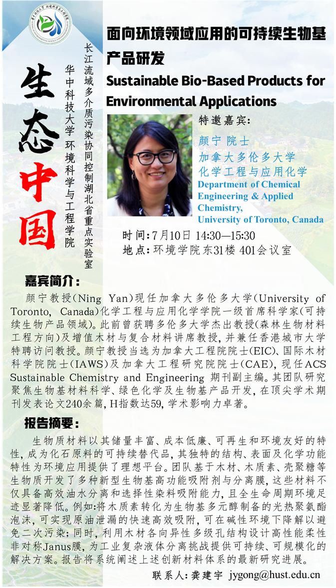 “生态中国”系列讲座-加拿大多伦多大学(颜宁 院士)-面向环境领域应用的可持续生物基产品研发