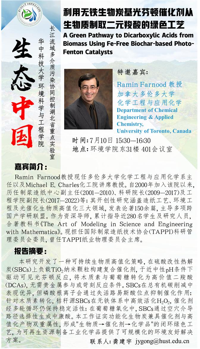 “生态中国”系列讲座-加拿大多伦多大学(Ramin Farnood 教授)-利用无铁生物炭基光芬顿催化剂从生物质制取二元羧酸的绿色工艺