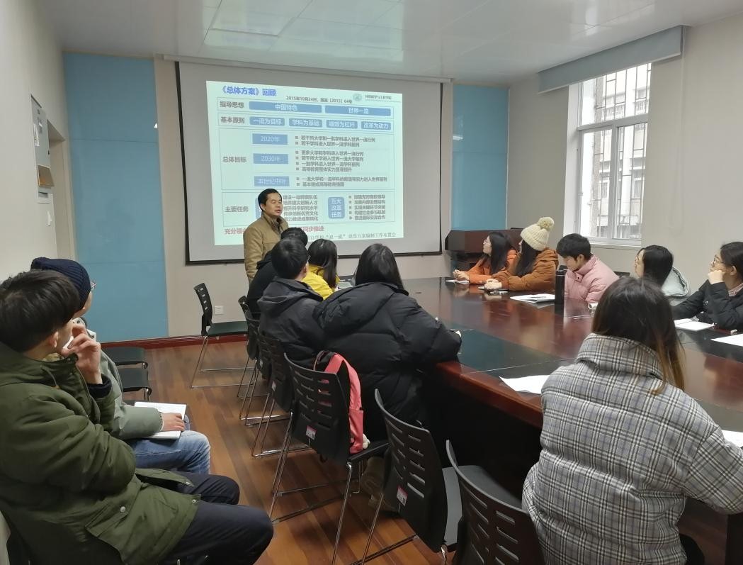 2019114日上午,教师党员杨家宽经理在​beats365216会议室带领硕士环工17级党支部全体党员进行“公司‘双一流’建设及公司特色团队建设”的专题学习。