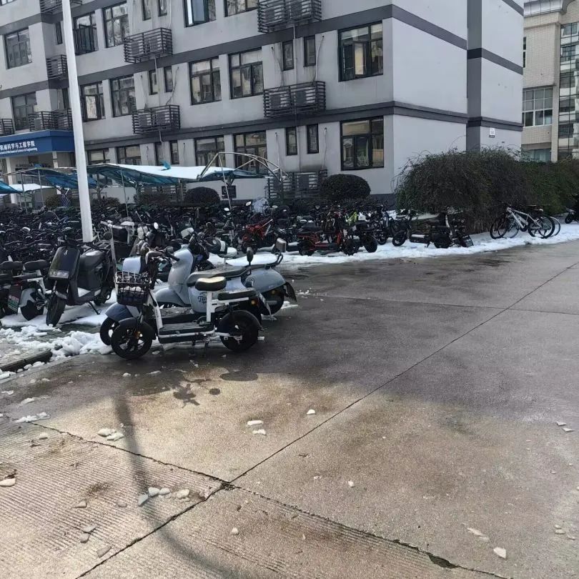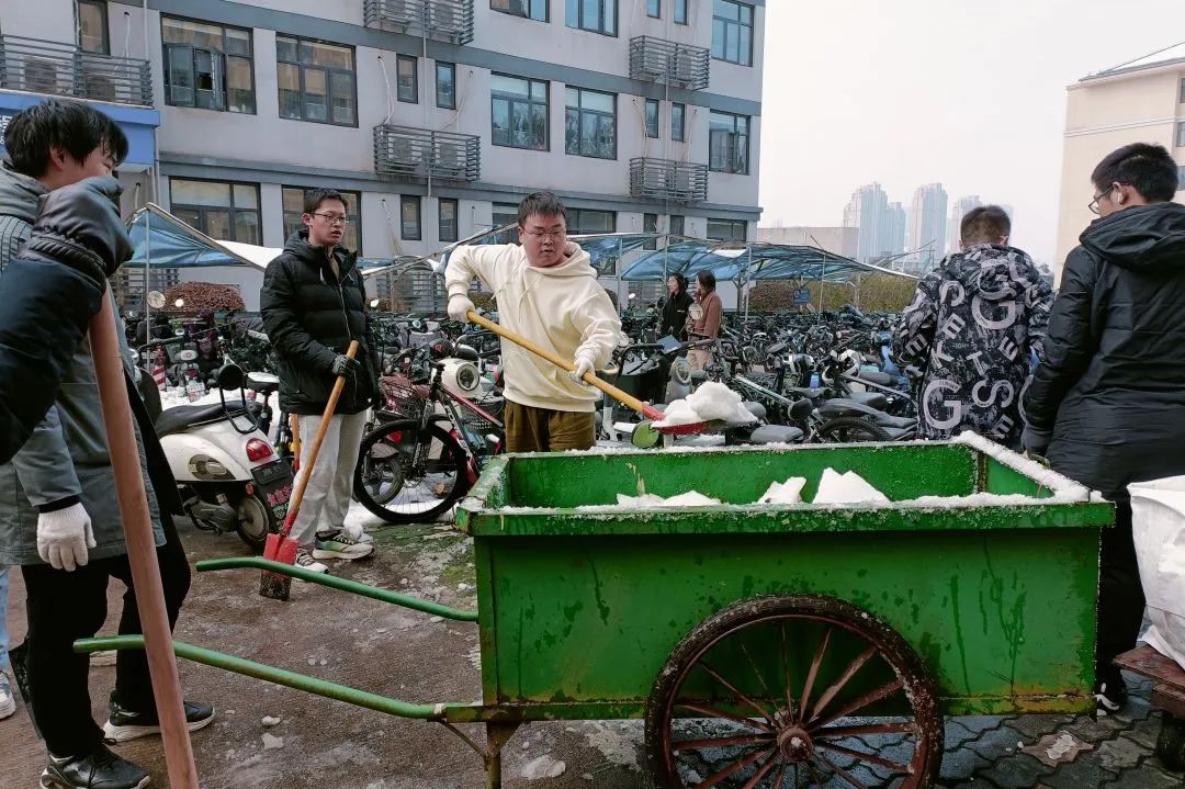 师生分工合作,先拓宽了18栋门前的主路。在保障同学们有一条安全的步行道路基础上,再将车棚旁的积雪铲除装车运走,让电动车能自如进出。