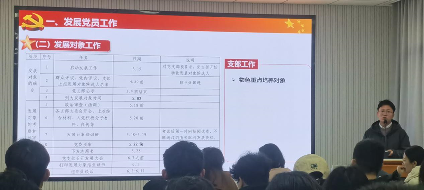 会议第三项,布置近期党建工作。杨凯介绍了支部书记培训班计划和近期发展党员工作安排,要求各支部应尽快制定全年详细工作计划,广泛听取支部同志意见,严格落实计划确保党建工作顺利展开。