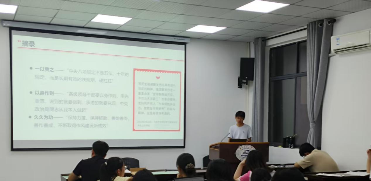 辅导员杨凯和梁震同志领学了中央八项规定精神。党的作风关系党的形象,关系人心向背,关系党的生死存亡。制定实施中央八项规定是我们党在新时代的徙木立信之举,必须常抓不懈、久久为功,党员同志应该深入学习贯彻中央八项规定精神,严格要求自己,深学笃行,以学促干,持续筑牢作风建设堤坝,以好作风好形象引领开创新局面。