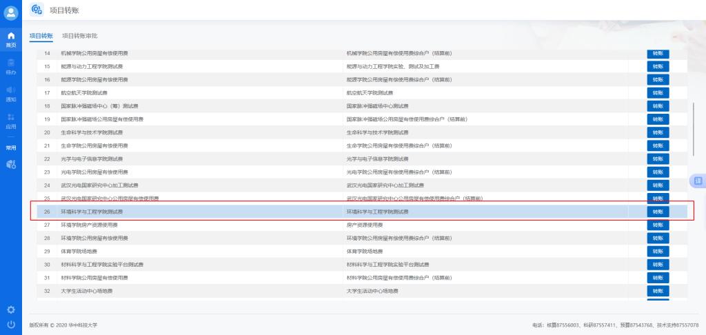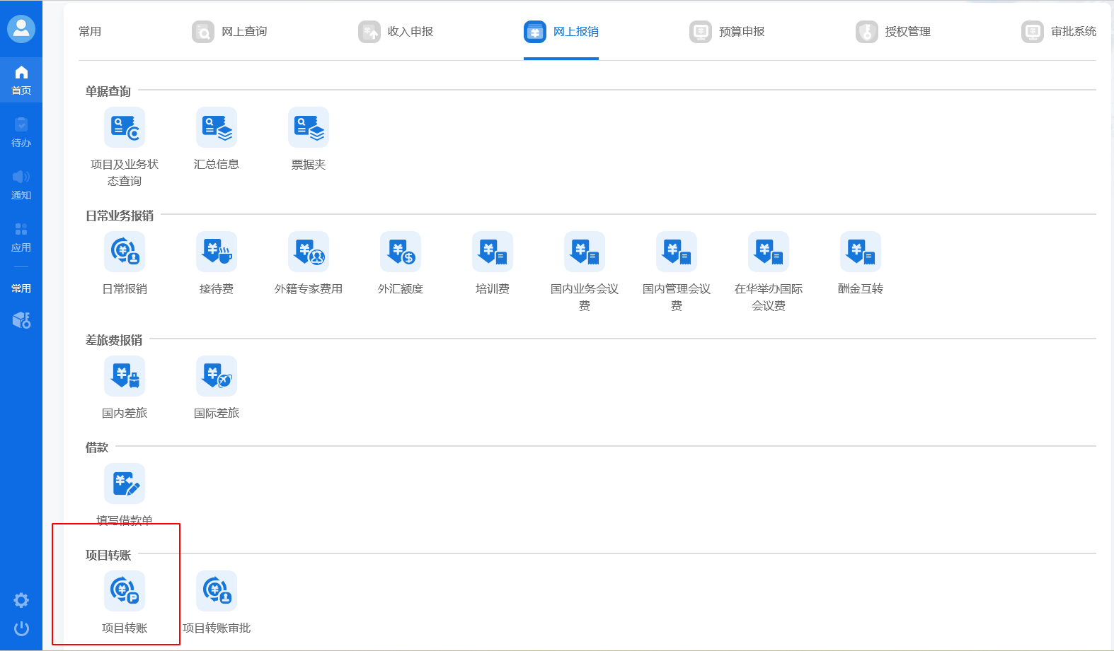 1、经费负责人(或科研秘书)登录校财务系统,选择“网上报销”界面,点击项目转账  (具体页面位置见下图);