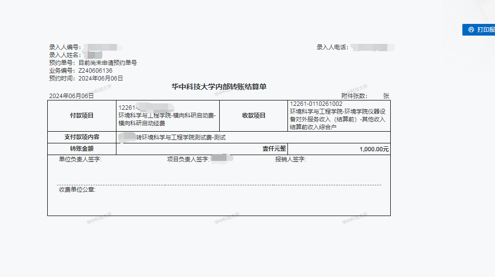3、填写下述转账信息(见下图)提交线下签字,生成内部转账结算单;打印出纸质版,经办人签字,项目负责人签字。